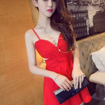 2016夏季新款夜店女裝低胸v領短裙性感露背吊帶小短裙A字裙連衣裙 /