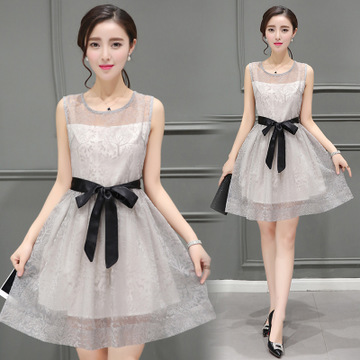 2016夏新款韓版修身顯瘦小香風A字裙歐根紗中長款假兩件連衣裙 /