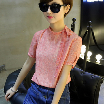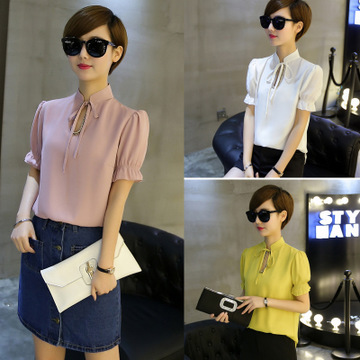 2016新款韓版雪紡蝴蝶結(jié)系帶時尚雪紡襯衫女裝百搭修身 一件代發(fā) /