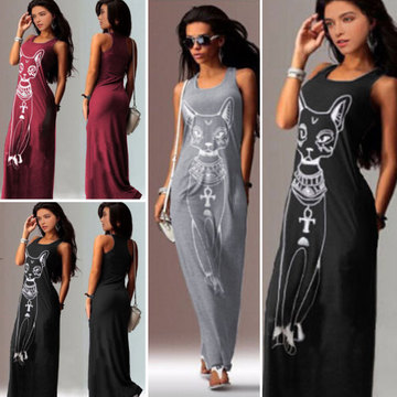 Ebay速賣通秋季爆款 小貓印花無袖灰色長款連衣裙 /