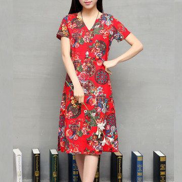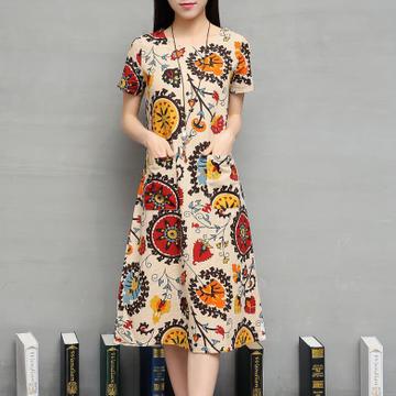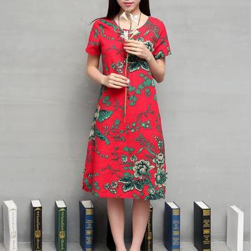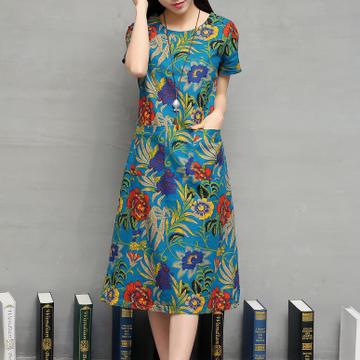 婧桀 2016夏裝新款中長款短袖寬松修身棉麻連衣裙收腰文藝民族風(fēng) /