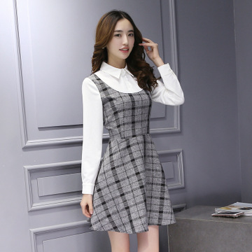 翻領格子長袖連衣裙 2016新款清新優雅學院風拼接A字裙擺連衣裙 /