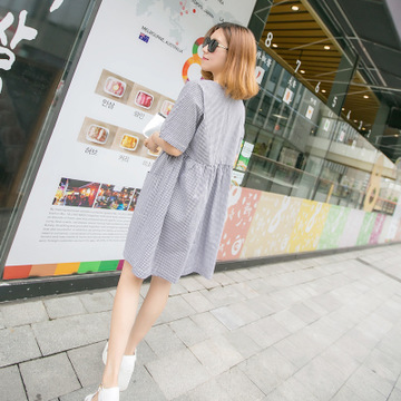 韓版時尚孕婦裝連衣裙夏裝寬松大碼孕婦格子裙 /