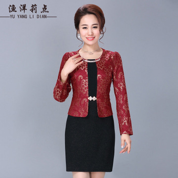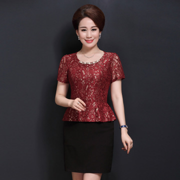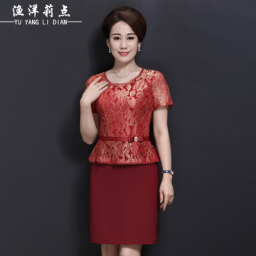 2016中老年夏季新款修身顯瘦優(yōu)雅名媛假兩件套鏤空蕾絲短袖連衣裙 /