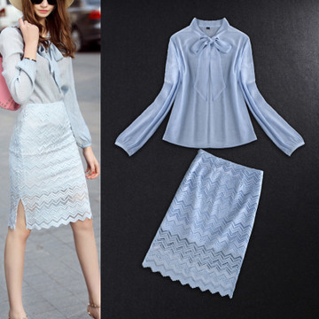 2016女裝新品套裝 系帶領長袖襯衣+蕾絲半身包臀開叉裙套裝裙 /