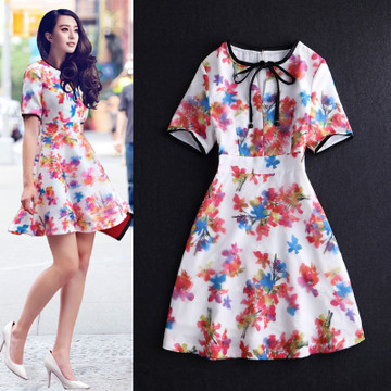 2016夏裝新款連衣裙 范冰冰明星同款短袖印花修身V領系帶大擺裙女 /