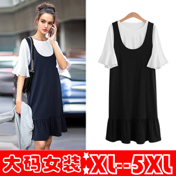 批發(fā) 歐美大碼 大碼女裝 胖MM時尚荷葉袖兩件套背帶裙連衣裙 /
