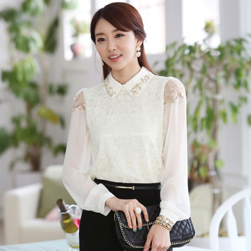 新款韓版女裝長袖娃娃領雪紡衫手工釘珠白襯衫打底衫女一件批發 /