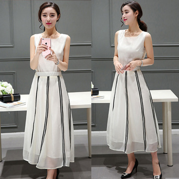 2016新款歐根紗兩件套連衣裙夏氣質長裙女半身裙顯瘦雪紡套裝裙子 /