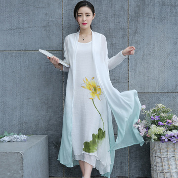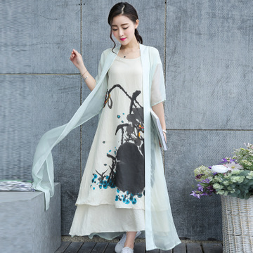 2016春季新款棉麻連衣裙女長袖套裝裙文藝復(fù)古水墨印花兩件套長裙 /