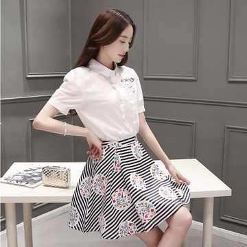2016夏裝新款荷葉邊印花短袖襯衣+印花短裙套裝裙 /