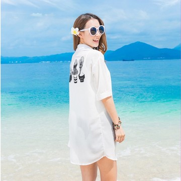2016夏沙灘防曬衣女中長(zhǎng)款雪紡素描頭像印花開衫外套薄 /