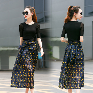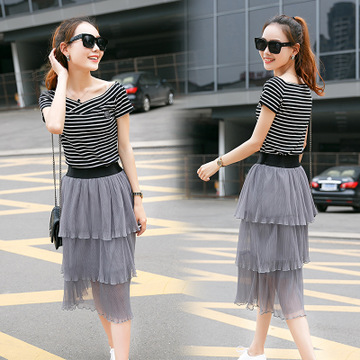 刺繡條紋短袖女紗裙套裝夏女裝新品棉T恤蓬蓬裙中長裙兩件套混批 /
