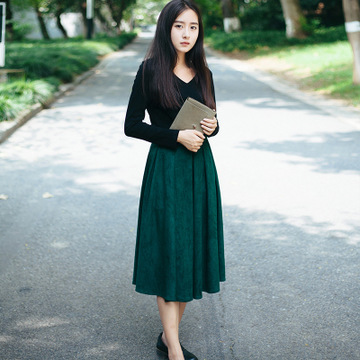 原創自制麂皮絨A字裙文藝復古墨綠半身裙同款秋冬新款 /