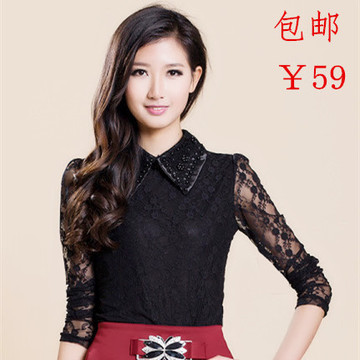 2016春裝新款韓版長袖上衣翻領訂珠修身大碼蕾絲打底衫女小衫批發 /