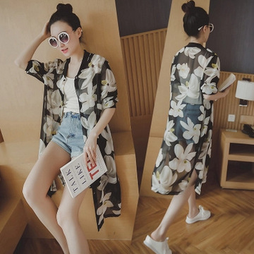 2016夏季新款韓版中長款薄款花朵印花雪紡防曬衣風衣外套 /