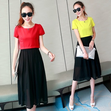 雪紡連衣裙女歐洲站2016夏裝新款假兩件修身女中長裙韓版女裝裙子 /