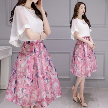 2016夏裝新款韓版修身歐根紗印花連衣裙兩件套中長款雪紡A字裙 /