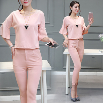 2016春夏新款韓版荷葉邊喇叭袖上衣九分褲休閑時尚套裝 /
