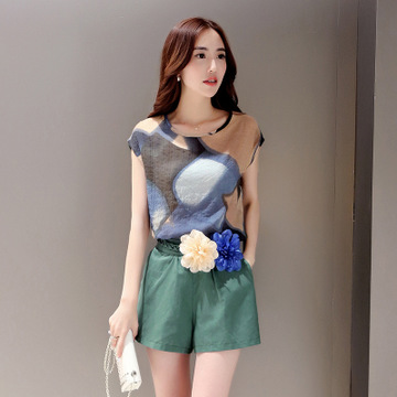 2016時尚套裝夏裝新款女裝韓版棉麻印花上衣短褲闊腿褲休閑兩件套 /