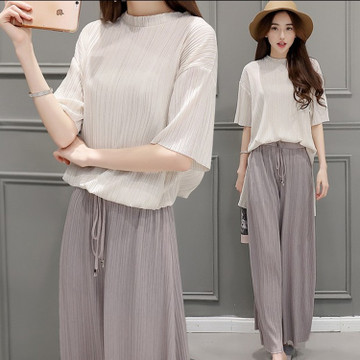 2016春裝新款韓版女裝氣質(zhì)中袖兩件套針織褶皺闊腿褲時尚套裝 /