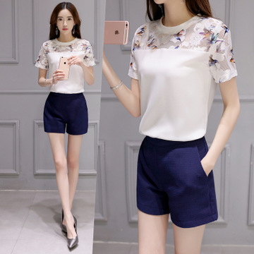 時尚套裝女2016夏季新品韓版印花蕾絲拼接短袖雪紡衫短褲兩件套 /