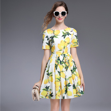 2016夏季女裝連衣裙 新款時尚檸檬印花釘珠修身高腰連衣裙 /