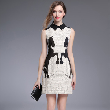 2016夏季時尚動物印花翻領修身無袖連衣裙 /