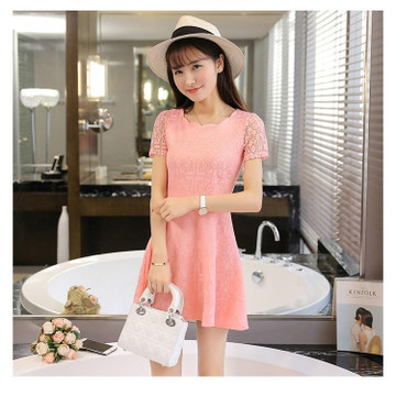 2016夏裝新款韓版收腰顯瘦花邊領純色蕾絲短袖連衣裙批發 /