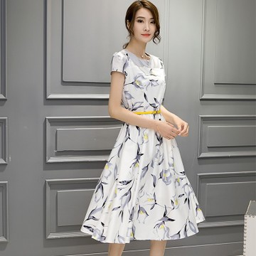 2016夏裝新款女裝修身顯瘦淑女裙子印花中長款短袖連衣裙女批發 /