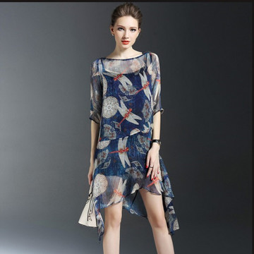 2016夏裝新款女裝潮歐美氣質(zhì)修身不規(guī)則真絲印花連衣裙現(xiàn)貨好質(zhì)量 /
