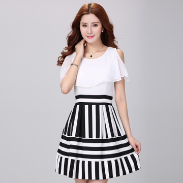 2016夏裝新款雪紡短袖連衣裙條紋拼接露肩大擺裙子女一件代發(fā) /