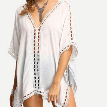 速賣通2016夏鏤空花邊拼接寬松大碼不規則下擺中袖連衣裙 /