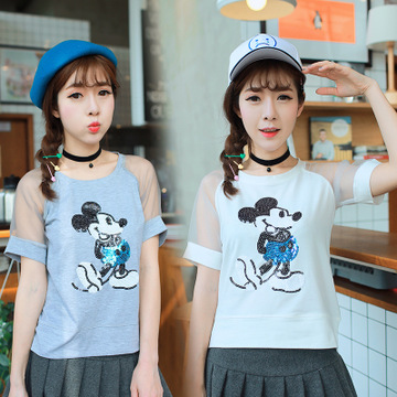 實拍韓版短袖t恤女寬松上衣創意刺繡網紗修身百搭夏裝卡通潮 /