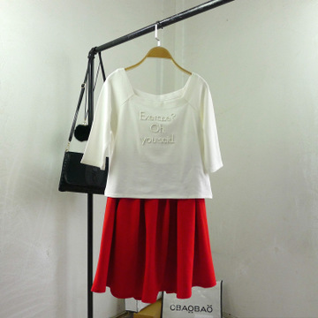 專柜單 2016夏裝修身連衣裙女廓型一字領中袖短款T恤+百褶半身裙 /