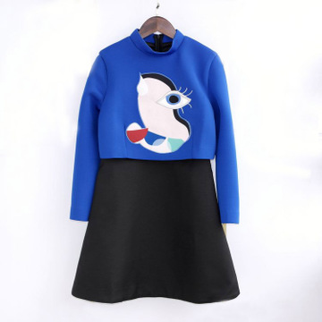 專柜單2016春季新品眼睛刺繡高腰拼接假兩件空氣棉連衣裙A字裙 /