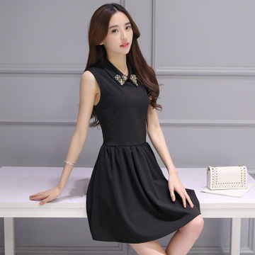 2016夏裝新款小清新時尚短裙釘珠立領拼接無袖連衣裙女 /