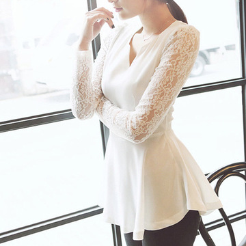 韓版蕾絲長袖雪紡衫修身顯瘦v領上衣中長款氣質蕾絲衫女 /