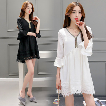 2016春新品女裝 韓版寬松喇叭袖拼接蕾絲雪紡連衣裙 /