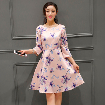 歐貨女裝2016新款春裝印花中裙一字領七分袖連衣裙打底修身A字裙 /