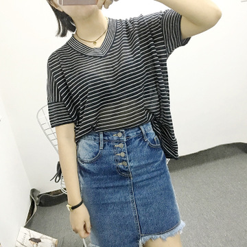 THXU2016韓版春款女裝寬松打底衫百搭V領條紋短袖T恤檔口批發1080 /
