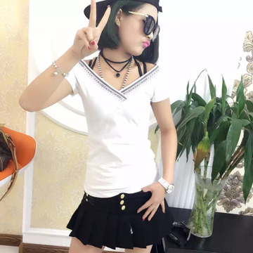 2016歐洲站新款數字印花一字V領露肩短袖T恤女上衣 /