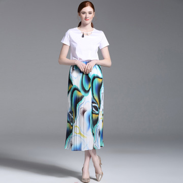 2016女裝春夏季裙子新款歐美長款百褶裙高腰印花長裙半身裙女 /