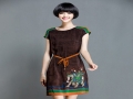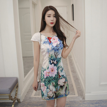 2016年夏季女裝新款 復古時尚印花修身顯瘦圓領短袖連衣裙旗袍裙 /