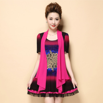 2016夏新款印花 中老年媽媽裝短袖假兩件連衣裙 /