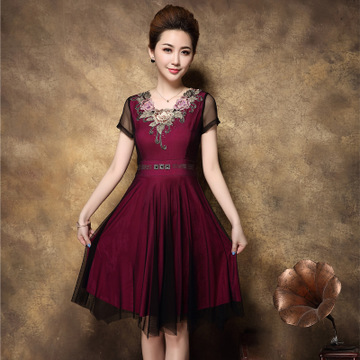 2016新款中老年媽媽裝蕾絲網(wǎng)紗刺繡中長款連衣裙 /