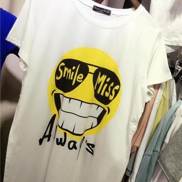 2016韓國東大門夏季新款時尚可愛笑臉字母中長圓領短袖T恤連衣裙 /