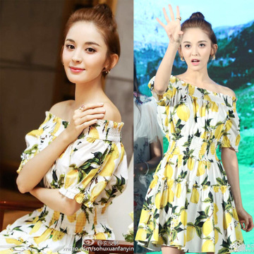 古力娜扎明星同款2016夏季一字領松緊腰短袖檸檬圖案印花連衣裙女 /