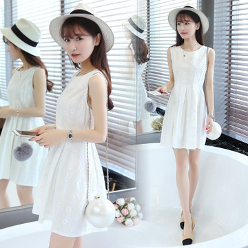 2016夏裝韓代購小清新韓版收腰純色修身棉麻連衣裙背心裙 /