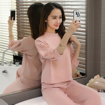 2016春裝新款韓版圓領純色泡泡袖上衣+闊腿褲休閑套裝女潮 /